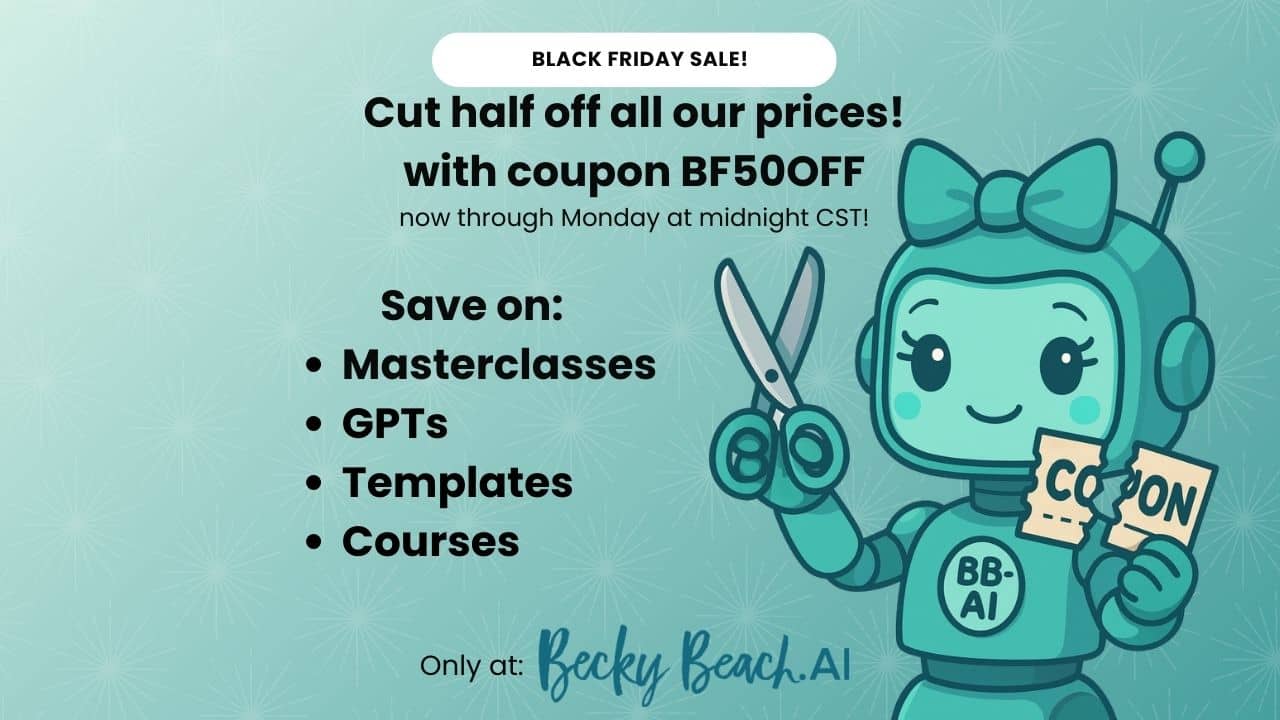 How's it going, Reader? It's been a marvelous Monday! I have launched my Black Friday event today with the 5 Days of BF Bundles. Every day for 5 days, a new bundle is unlocked on the sales page here. Your ThriveCart partner link: https://beckybeach.thrivecart.com/5-days-bf/partner/ Link template: https://USERNAMEHERE--beckybeach.thrivecart.com/5-days-bf/ Important: If you are promoting, please email me so that I can add all the courses to your account so you get credit for the sale. You can...