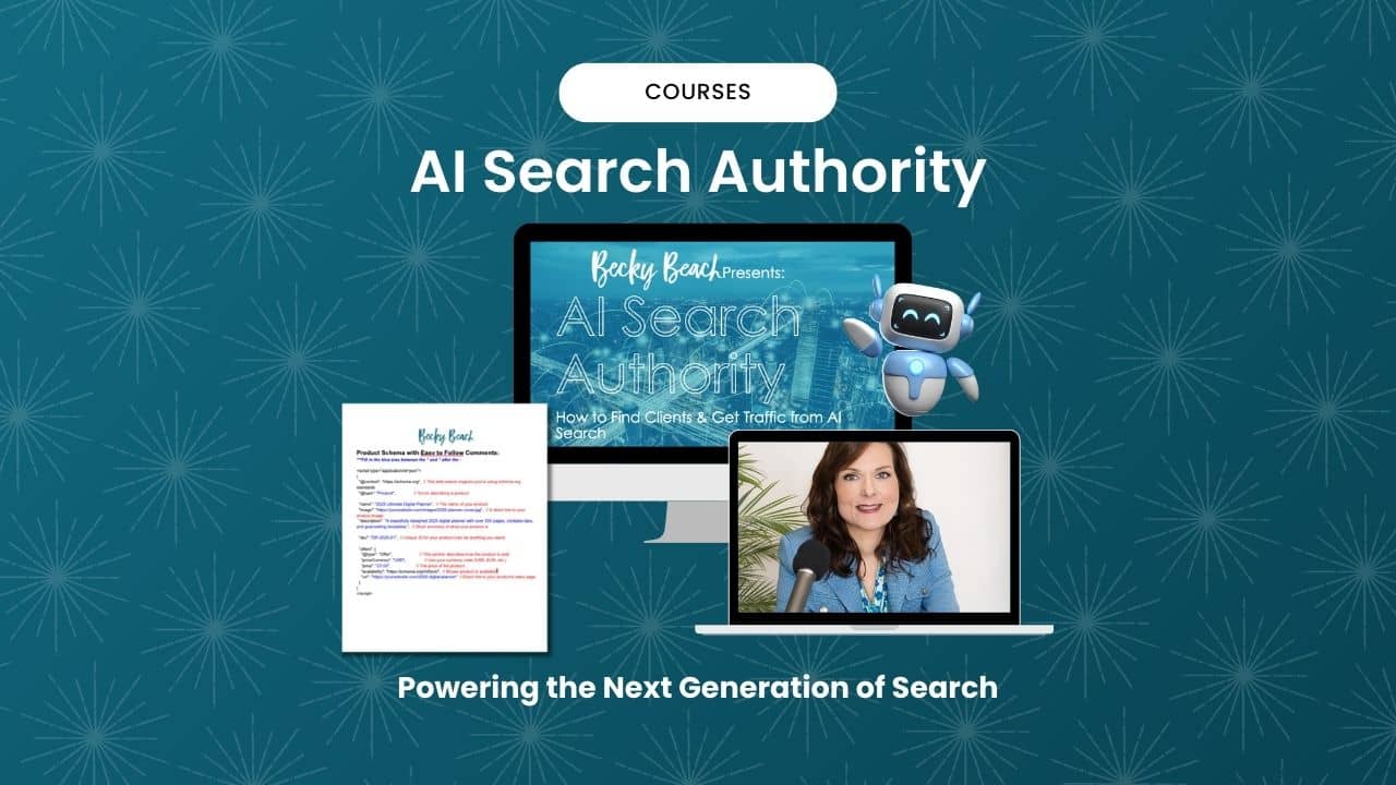 My new course on AI search has been released! AI Search AuthorityAI Search Authority is your step-by-step course to getting discovered, recommended, and trusted by AI search assistants — the new gatekeepers of online visibility. Created by me, who has gotten several new high-paying clients from AI search. 💡 Why This Matters NOW Google isn’t the only search engine anymore. People are now asking ChatGPT, “Who’s the best [coach/course/product] in [niche]?” If you’re not visible in AI-generated answers, you’re invisible. But there’s good news: AI recommends creators and businesses that display authority signals — and this course shows you exactly how to build them, fast. 🧠 What You’ll Learn Inside AI Search Authority: ✅ How to position yourself as a go-to expert AI trusts ✅ The types of content that train AI algorithms to cite you ✅ Where and how to publish for maximum AI visibility ✅ How to optimize your site with structured data and schema ✅ Strategies to turn AI search into a lead and client machine ✅ How to pitch and sell this as a service to clients 🎁 Bonus: Plug-and-Play Schema Templates Skip the tech overwhelm. With our done-for-you Schema Markup Templates, you can instantly structure your website and shop listings to be easily recognized and indexed by AI platforms — boosting your chances of being featured in search answers and recommendations. No coding. No confusion. Just copy, paste, and get noticed. ⚡ Let AI Bring You Clients While You Sleep You don’t chase traffic anymore. You become the authority AI recommends. 👉 Enroll in AI Search Authority Now and start getting discovered where the future of search is happening. Only $47 now through Sunday with coupon AISEARCH100, then price goes up to $67 for a week the full price at $147. **Business Beach Club members got this as part of their September content! If you are a member, do not purchase as it's already in your account.