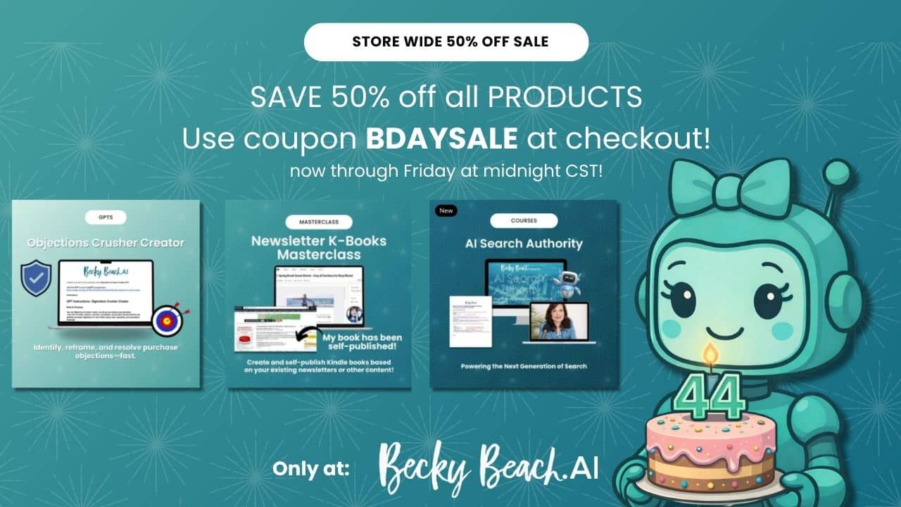 How's it going, Reader? I've had a great Saturday! I went to a convention today and got some cool stuff to add to my doll collection. I thought I would pop in real fast and make sure you were aware that the 50% off sale is ending tonight at midnight CST. If you want to skyrocket your business with my amazing products, you can get it now for less. Hurry, because the coupon BDAYSALE is expiring in hours! Ends in: 50% off BeckyBeach.AI Birthday Sale - Last Day!I'm celebrating by having a quick 50% off sale at BeckyBeach.AI to celebrate my birthday on Friday. I'll be 44 years old! You can save on:
